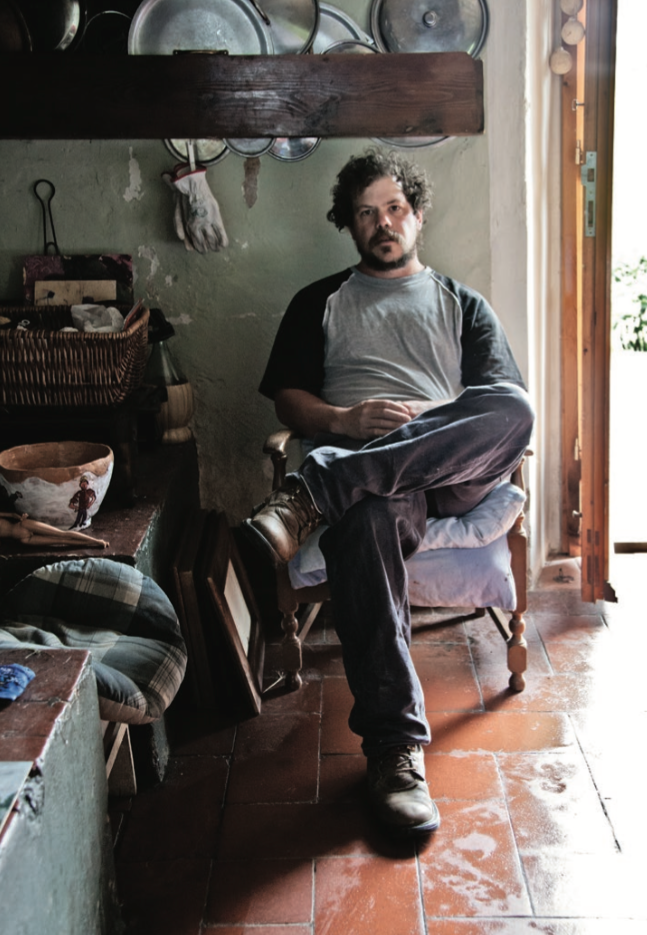 The photograph of Ben Fenske (b. 1978) sitting in the kitchen of his Chianti farmhouse is one of my favorites. The light streaming through the door, the work gloves hanging over his shoulder, and the lumberjack boots are details that perfectly distill the essence of this brilliant, hard-working artist. This image reflects Fenske’s diligent adherence to his process, which is focused solely on capturing light effects, regardless of subject. His practi- cal nature is revealed in this shot, since the kitchen is both his studio for still lifes and the subject of many paintings. Patrizia Genovesi also took several pictures of Fenske outdoors — his primary studio since he paints en plein air year-round.