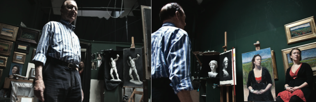 With light pouring down on him, Nelson H. White (b. 1932) stands proudly before an Olympian plaster that hints at his own Herculean energy. Patrizia Genovesi’s decision to shoot this crisp, organized portrait from below deftly underscores the respect that White commands as the senior artist working at the Florence Academy of Art. Descended from a long line of New England artists and art historians, White is an important link to early 20th-century American art, and he generously shares his firsthand stories with younger colleagues. The photograph at right shows White contemplating his female model, who is posed before his own landscape painting. Visible between them is another artist’s sightsize exercise, a technical challenge White has also mastered.
