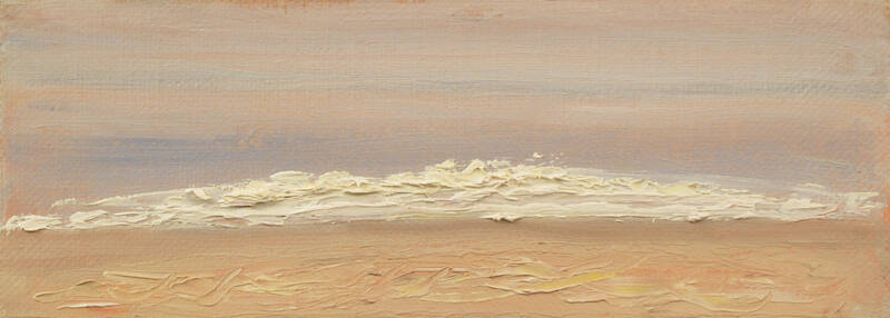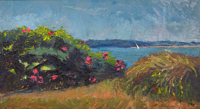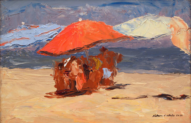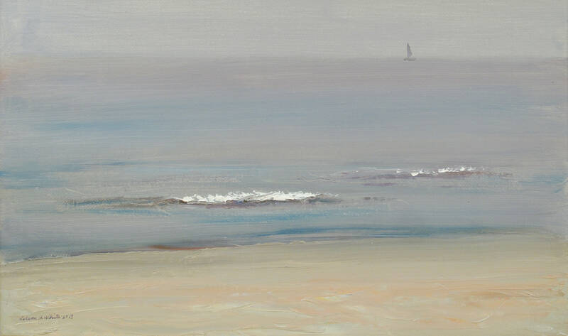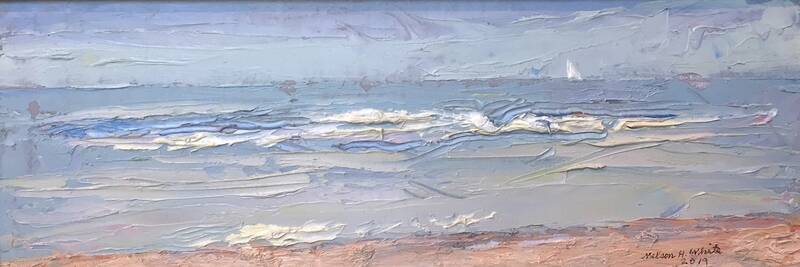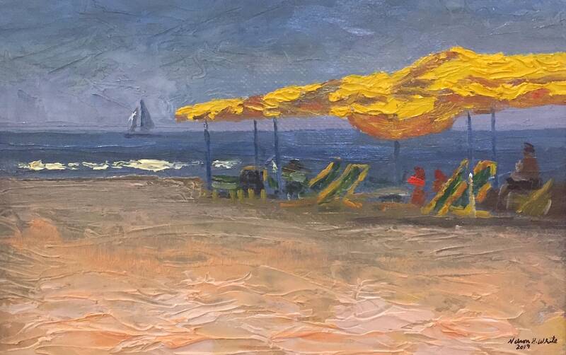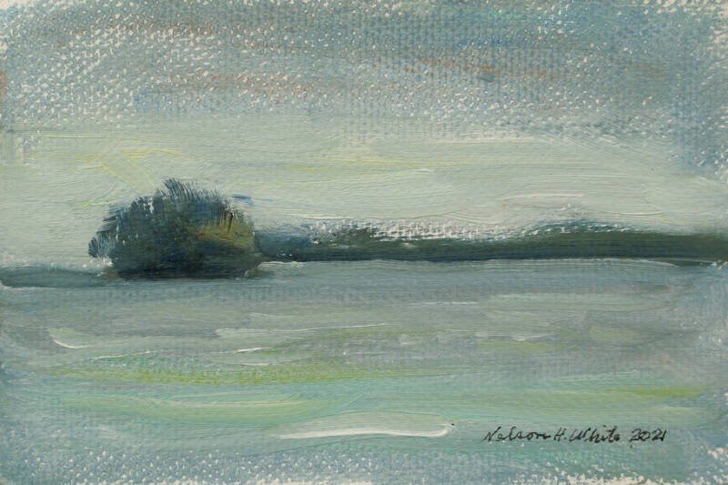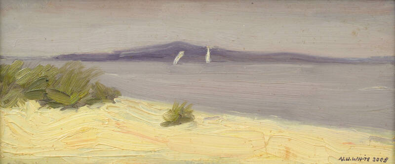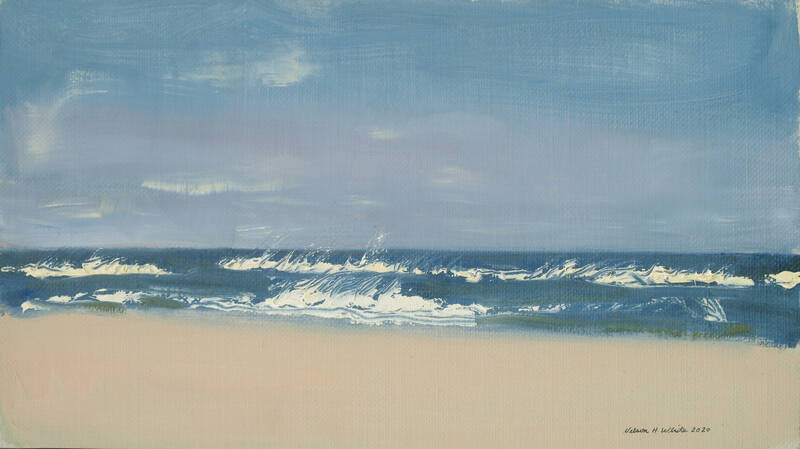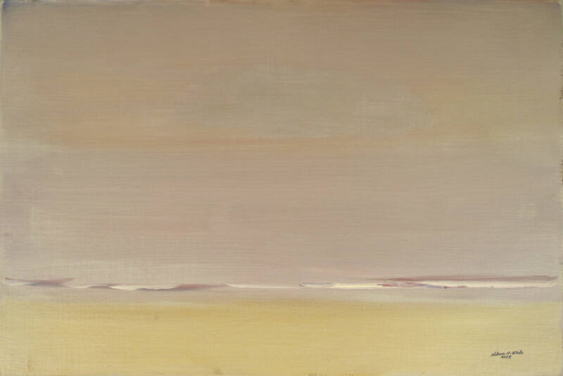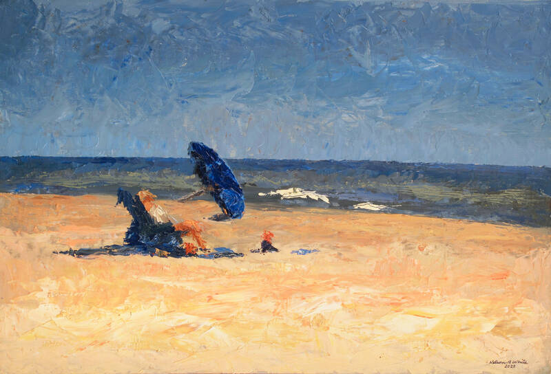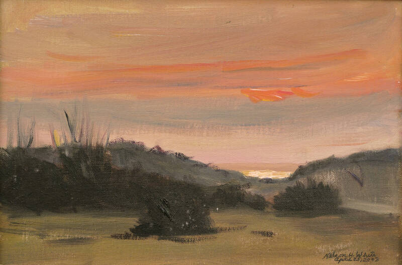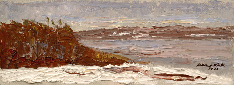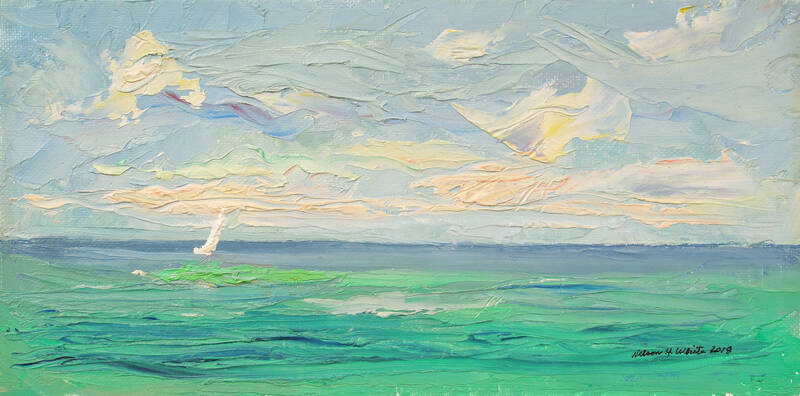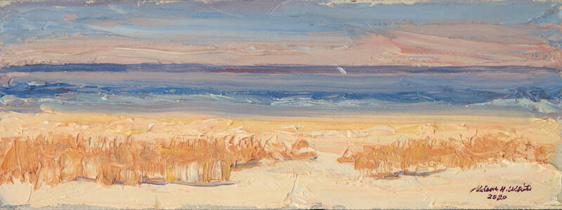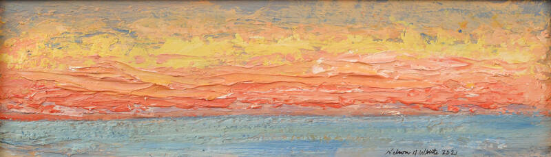 By the winter, we see that he pushed this move towards abstraction even further with "Coopers Beach Dec 27th" and "Sunset Seas and Sky, Feb 2021". These latest works feel like an apt culmination of over 70 years of painting out of doors, "en plein air". White, like many masterful painters as they enter their latter years, has eliminated unnecessary distractions from his compositions. After so many years of looking directly at color in nature, his mission has narrowed. In these latest works, White's sole focus has shifted to capturing the magic of the light, through pure color, deftly and liberally laid on his canvas, in wise yet still fresh marks.