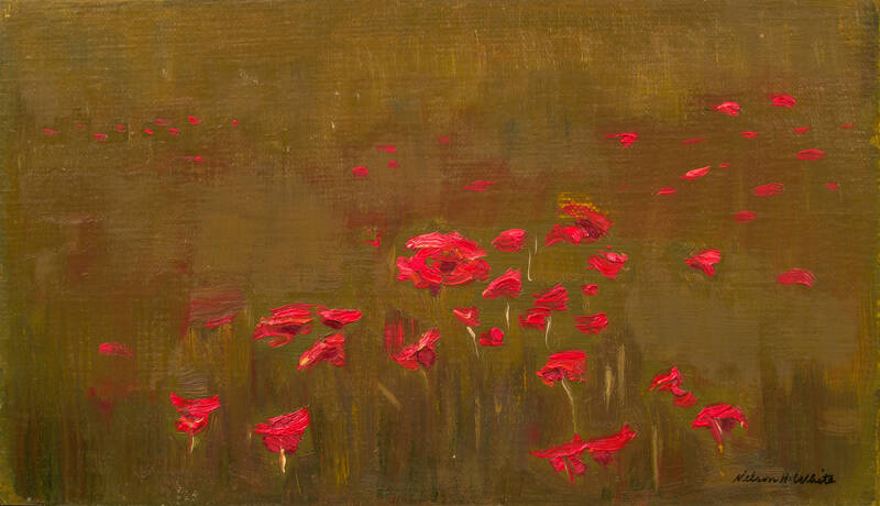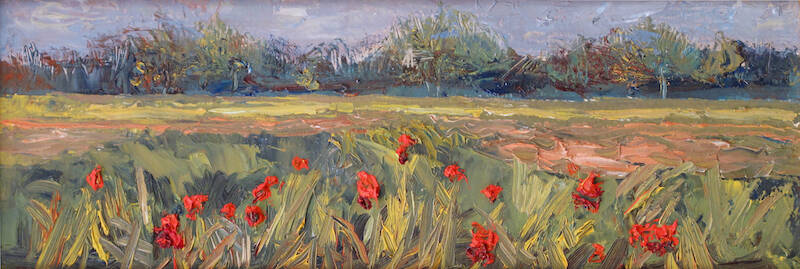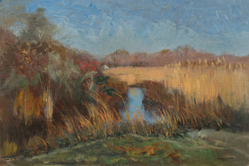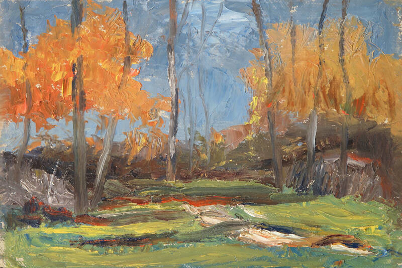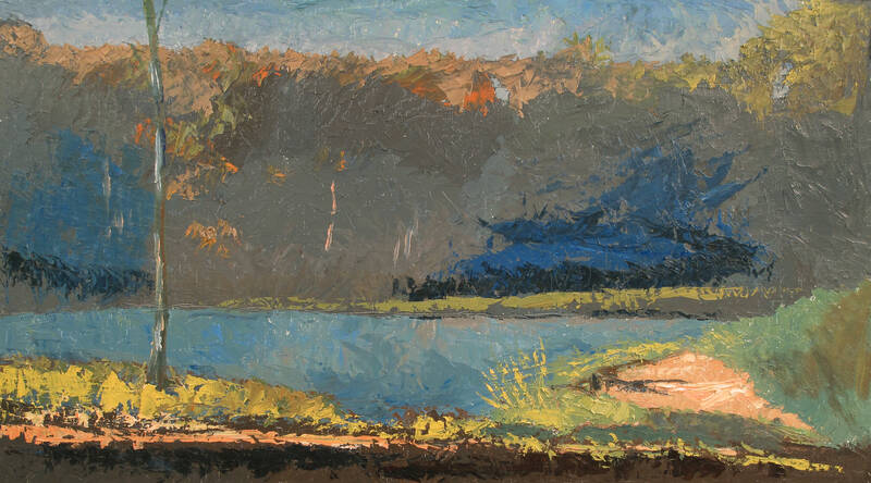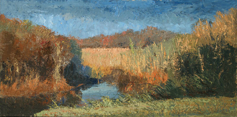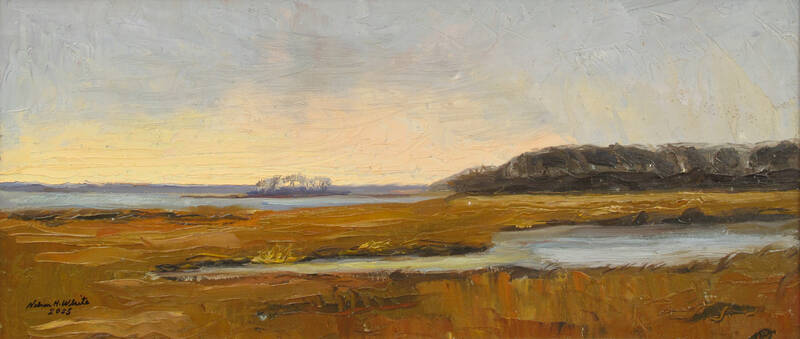 Interestingly, there's a seismic shift in his work this year, which is likely due to the Pandemic's disruptive impact on his traditional movements. After the summer sequestered on Shelter Island and in New London, White was barred from travelling back to his beloved life in Italy for the first time in over 65 years. His first winter in the United States in a very long time, has yielded some breakthrough autumnal scenes with "Autumn Creek, Lot 9", and the two "The Road, Shelter Island" paintings. Here White has pushed the color envelope, added more impasto than ever, and simplified the details which has somehow modernized and flattened the images. Most notable is the introduction of an almost dayglow orange, which pops against the bright blue skies, a quintessential East End sight throughout the autumn. These joyous paintings also recall the finest works of his father Nelson C. White and grandfather Henry C. White, who both reveled in the heat of this season's palette.