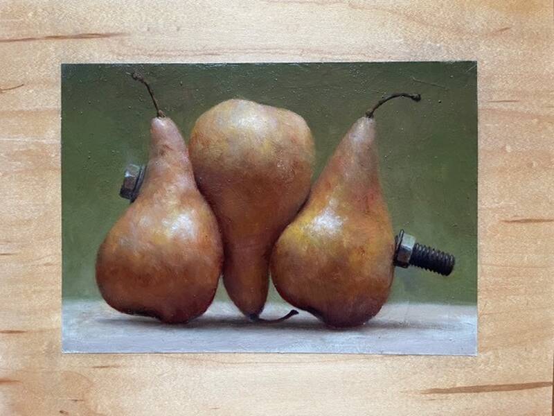 Next, in his pair of female nudes, we see an empowered eve managing the snake in "Awakening" and a forlorn mermaid in "Dusk". Ackrill's respect for women and their power is seen in his decision to make these figures heroic in scale, in relation to their environment. His handling of paint and ability to capture texture and surfaces is well matched by his knack for quirky questions that his paintings force the viewer to mull. Lastly, to our delight, Ackrill delivers another small and funny still life, titled "Family Ties". Ackrill stations his wit alongside his trained hand, bonding the sumptuous fruit by means of a rugged, industrial bolt. Finally someone finds a new angle for the ubiquitous and, to many clasically-trianed painters who've arduously painted this subject, time and again, the now dreaded pear still life.