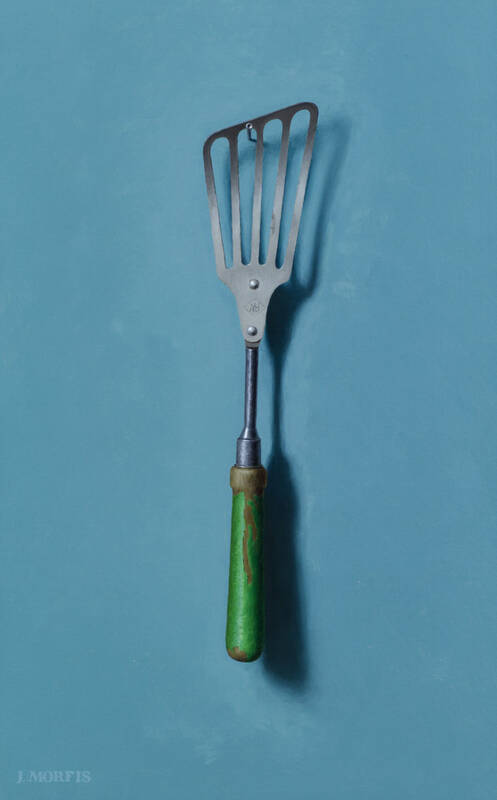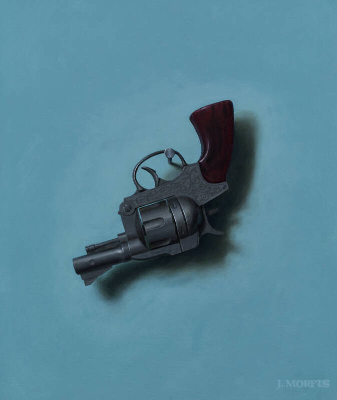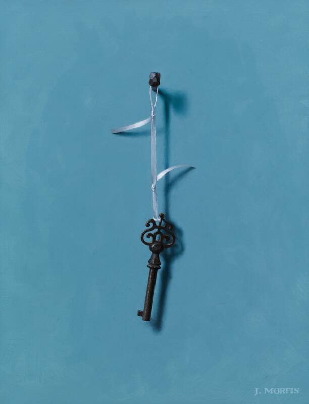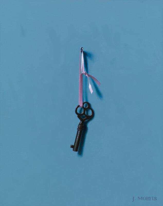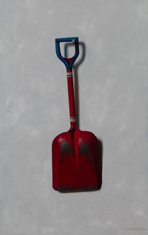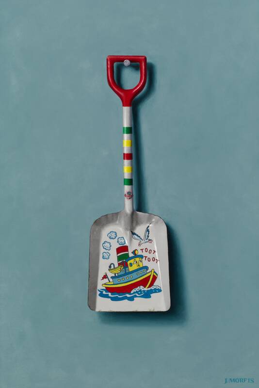 John Morfis, (B. 1976) delivered a lovely combination of mesmerizing trompe l'oiel paintings of his treasured single hanging objects. These acutely observed objects visibly pop off of their surfaces, as Morfis's ability to render combined with his natural sense of color create memorable iconic images. Working directly from nature in his light-controlled studio for many hours on each painting, these 11 paintings account for the better part of this year's work. The large "Paddle" painting, on his perfectly toned "overcast sky blue" background, combined with the "Buoy" on the dark blue background make an impressive pair of major works for this diligent and poetic painter. There are also two new key paintings, which are always the first paintings to sell, as well as three new antique beach shovel paintings. Interestingly, he has a cap gun hanging upside down on a nail, which may or may not be a political statement. Either way, this toy cap gun looks decidedly inert as a weapon so, instead, with this painting we can enjoy the lines and the tones of the object separate from the danger it could normally connote.