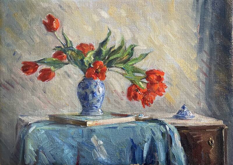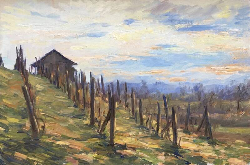 Her love of color is displayed in their small but gorgeous series of paintings of the autumn and the spring around their home. The "Autumn Glory" painting deftly puts the orange persimmons against that deep blue autumn sky delivering a delicious visual effect.