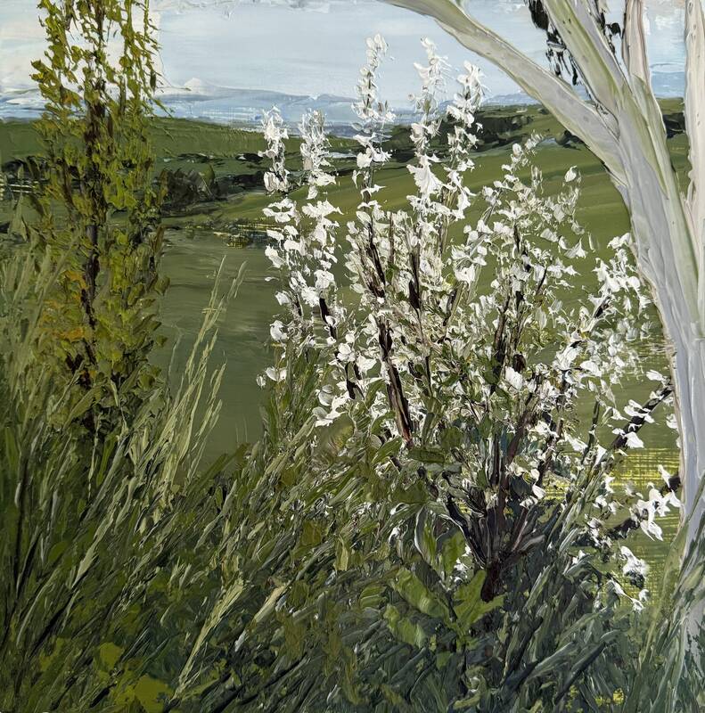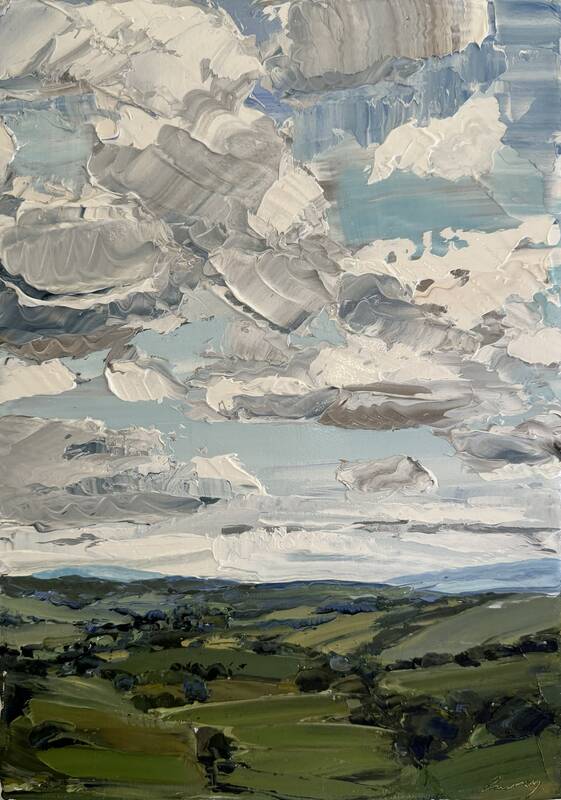 Persson’s clouds are ones you want to reach out and touch due to her work with the palette knife, smoothing the white paint like icing on a cake. “It Was Nice” is a glorious frenzy of clouds—the sky takes over three quarters of the composition. Abundant white paint slathered onto the canvas meet shadows of grey and blue in a spectacular maze of billowing vapors. Beneath is a patchwork quilt of green paints demonstrating the lush, verdant hills of her homeland.