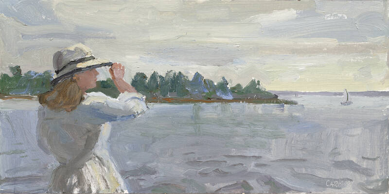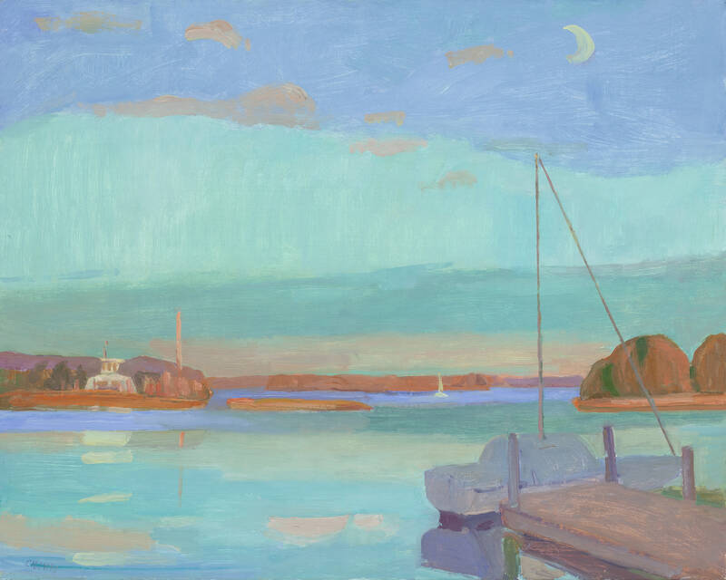 The composition for Pink Reflection began with a plein-air pastel drawing, with Carmody sitting on the bridge at Dering Harbor. In the pastel, we see a colorful sky with clouds scattering just after sunset. The horizon is intersected by masts from an assortment of sailboats. In the foreground, water runs out from beneath the bridge she sits upon, flowing into the harbor, the current accentuated by a simplistic design of little V shapes. When Carmody translated this plein air sketch onto a canvas, she made decisions to omit a lot of what she saw on site. She emphasized the stillness of the harbor, where the pink sky casts a bright reflection onto the water’s surface. The sailboats intersecting the horizon were entirely omitted, heightening a sensation of peaceful contemplation. The movement in the foreground is only annotated by her echoing the pattern of arrows pointing us toward the direction of the water’s current. What started as a plein air pastel, sparked by an interesting light effect, resulted in a studio painting that emanates light itself.