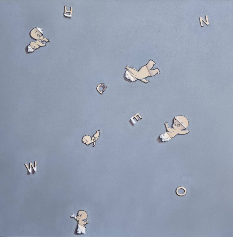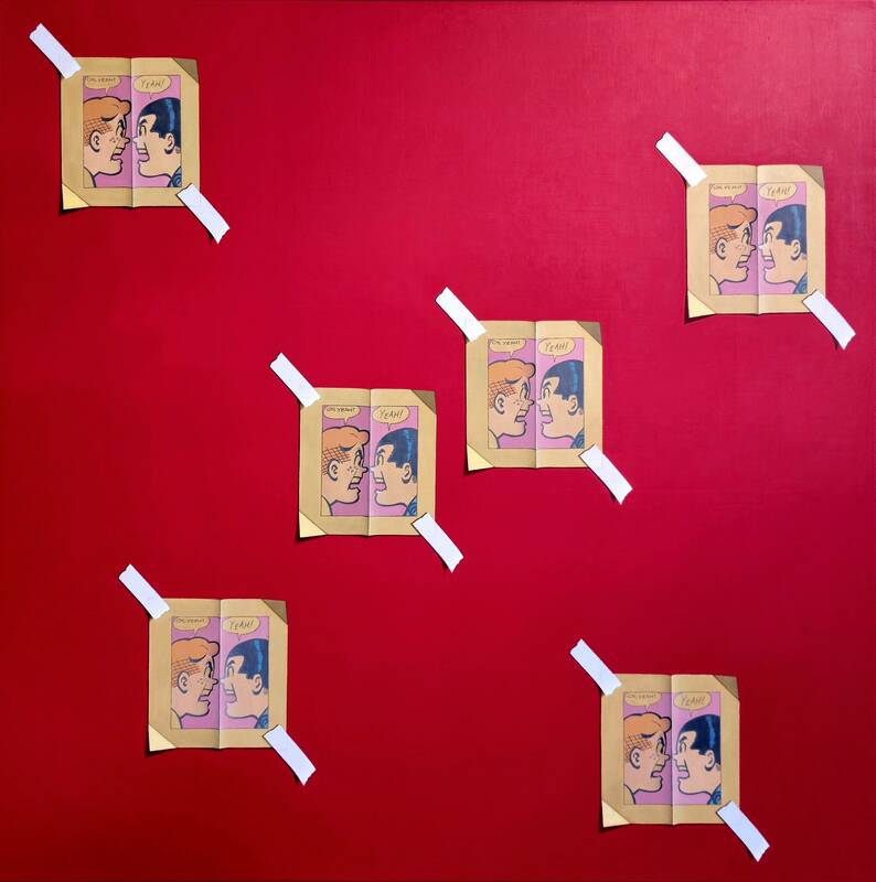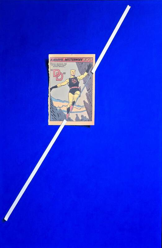 “Vertigo” does what is impossible to do in real life—it makes eternal the moment before this comic clipping of Daredevil inevitably folds over because of the way it is taped—aesthetically rather than functionally. The painting is forever held in suspense. Daredevil, blindly walking the tightrope between two buildings is suspended as well. The anxiety of everything crashing down and falling apart represents a vulnerable side of Mastromatteo’s state of mind as an artist, even as a person. However, there is so much opportunity when you are on the precipice. Daredevil might just get to the other side safely and become “the world’s two most famous initials” as the comic states. And Mastromatteo, in the process of creating a painting (a process of self-doubt and trial and error) might just create his own “Marvel Masterwork.”