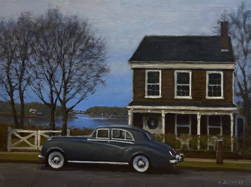 In Long Island in December Bretzke presents a Sag Harbor home on Capitan’s Row on a cloudy December day. An old Rolls Royce parked out front adds luxury and nostalgia to an otherwise humble landscape. Sag Harbor cove glistens blue in the background; still waters reflecting the overcast sky above.