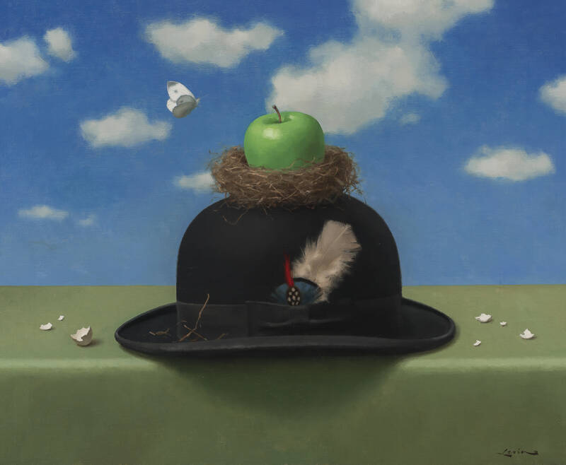 In an ode to one of the masters of surrealist dreamscapes, Steven Levin’s Magritte’s Hat he paints Magritte’s famous hat and apple from The Son of Man. As if it were an oversized egg, the apple sits comfortably in a bird’s nest. Levin loves to play with the visual similarities between feathered hats and birds’ nests. He calls it a “visual pun.” On the ledge the hat is sitting on, an eggshell has been broken out of, but—like the face in The Son of Man—no bird is in sight. Instead, a butterfly flutters above the nest.