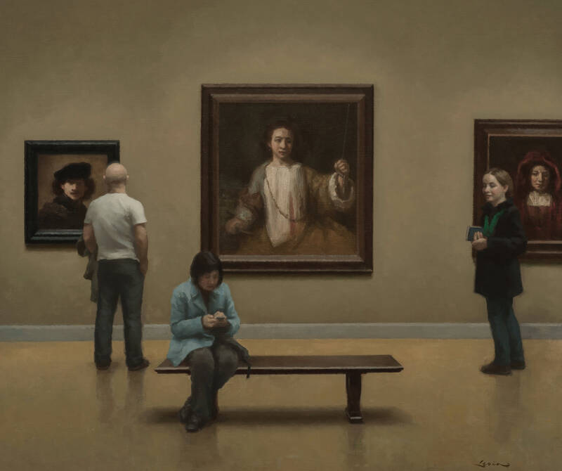In the largest work we have from Levin this year, he returns to a favorite subject: museum interiors. Three portraits by Rembrandt and three museumgoers populate the canvas. Interestingly though, the portraits seem to be more present than the people. One woman gazes, not at the paintings but off towards another seated woman who is engrossed in her phone. The man in the scene casually looks at one of the portraits from the side. The figures in the portraits meanwhile seem far more grounded and aware, watching the people and even us, the viewers.
