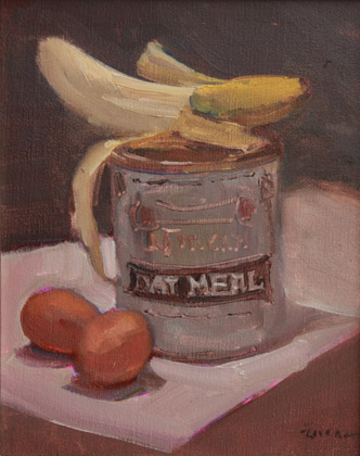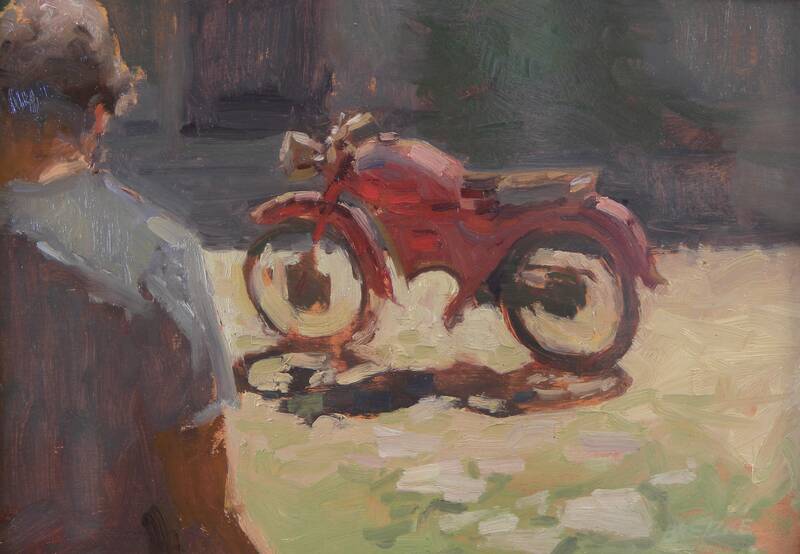 Travis Schlaht (b.1975) is a highly respected painter, represented in galleries in New York, San Francisco, Cape Cod, and Greenwich Connecticut. He was also an instructor at the Grand Central Academy of Art and the co-founder of the Hudson River Fellowship. His work has turned an important corner, which is why we are pleased to announce that he will be having a one person show in May of 2015. In this Gems show, there are two tantalizing hints at his new body of work with Schlaht's "Self Portrait" and "Red Suspenders".
