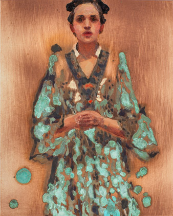 Kate Lehman (b. 1968) has always been an individual within a crowd of talented painters having studied at the Academy in Paris and the Water Street Atelier in Brooklyn. She has always created original images despite her deeply classical hand, and now she is also experimenting with different mediums. Painting on copper panels, with oil paints, as well as using acids to oxidize the copper, Lehman is creating rich and unpredictable marks, which she builds into her composition. Although the technical aspects of this expression are still being worked out, the cover image for our show "Venise" highlights the beginnings of a mesmerizing melding of mediums. Hints of Klimt's influence on Lehman are reappearing in these works, which we also see in Schlaht's most recent work. Lehman has also been sculpting for years, and we will have three small bronze sculptures here for this show. My favorite is the "Yin and Yang" which is a three dimensional riff on a painting we sold in 2001. Lehmans's elegant "In Repose" is one of the finest and truly contemporary nudes exhibited here in years, as this classical pose is modernized by the model's armband tattoo prominently displayed on the top arm. The deeply relaxed figure, in a dark grey and brown ethereal interior, painted in lower Manhattan in the early part of this millennium, recalls some of the other great nudes that marked their times like "Le Dejeuner sur l'herbe" and "Olympia" by Manet.