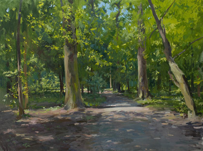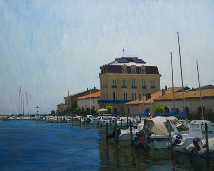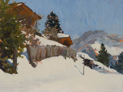 Dalessio's work stands apart from his peers in that he captures not only the light, the color, and architecture of a scene, but also somehow the feeling of a place. "Snowy Road" is a great example of this as it evokes not only the light but also the temperature and humidity of what it must have felt like to be standing under a tree on a snowy day looking down a service road towards the forest in Switzerland last winter. Dalessio is a passionate plein air painter, who has been working everyday, most of the day since I've known him. It is no wonder that this talented artist, who, after 25 years of working so hard toward capturing the truth in nature, is able to fill the gallery with beautiful work this month.