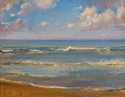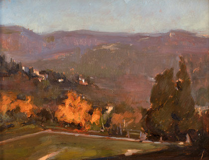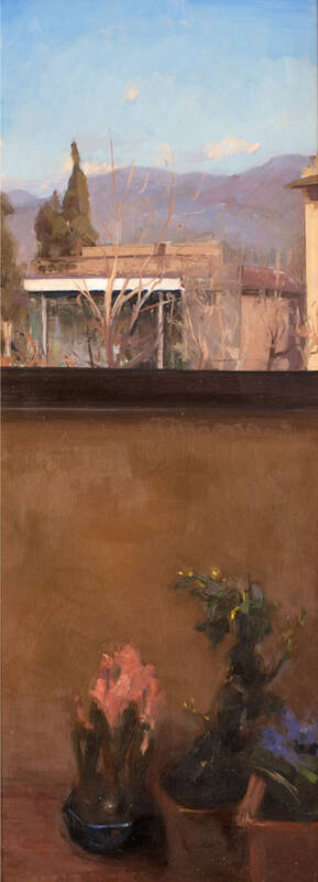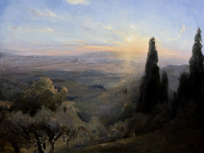 Melissa Franklin Sanchez (b. 1984) exhibits her latest work, created in her new hometown, Fiesole. Her sought after gem-like interiors are inspired by the likes of Hammershoi, with their dramatic lighting and deep sense of intimacy. Summer Light our favorite, sold before it even got a label put on it! Also, Franklin Sanchez made an important shift to painting on aluminum panels for technical reasons. While the copper is a warm toned base, it is also heavy and difficult to find large panels. There are also the final two candle paintings on copper, which literally glow. Franklin Sanchezs Collecting Memories harkens back to the finest Dutch still lives. We see a bolder more confident landscape painter, with two especially strong works Forget-me-not and Fiesole Sunset. This group of paintings clearly shows an artist inspired by her new environment and we look forward to more paintings.