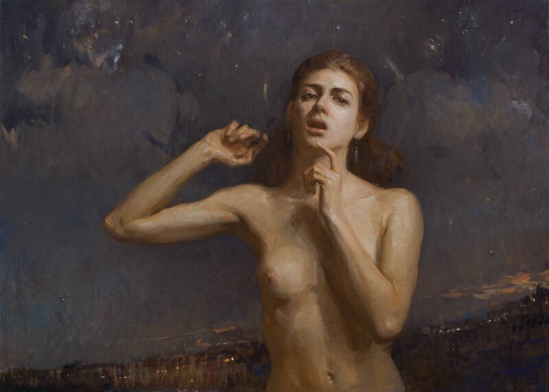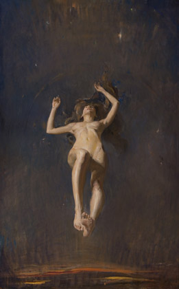 Ramiro (b. 1974), originally a classically trained musician, brings us a lyrical series of spiritual figurative paintings this year. Hymn is an homage to the way one expresses their spiritual elations through song. The young womans face belies ecstasy as she levitates above the Earth into the abstract realm of spirituality. Red and yellow hues streak the atmosphere below, depicting her passion and complete envelopment in the musical manifestation of a higher power. This breakthrough work by Ramiro merges his highly refined classical figurative narrative with an abstract background, creating a 21st century religious painting. It also recalls the sculpture Ecstasy of Saint Theresa by Bernini in Rome, which describes the intense joy of spiritual elation, attainable only when one relinquishes the worldly plane. Also technically, Hymn is a virtuosic work with the foreshortened legs and face.