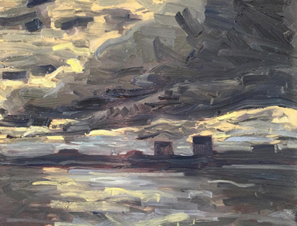 A work that fully expresses and articulates Dalessios rediscovery of Italy is Giudecca in Winter, where the artist eschews well-trod locales of Venice in favor of a small district, an island unto itself, separated by a canal. Further, where paintings of Venice are usually organized in horizontal lines, here we see and feel the solitude and isolation of the square on this damp, overcast day with the vertical lines of a chimney, a few trees, lampposts, and pilings poking out of the water--if not exactly a revisionist perspective, a decidedly personal one.