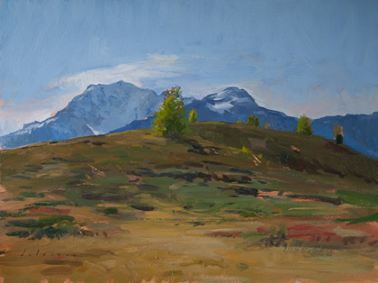 "Sunset, La Torricella" is another major work in this exhibit, influenced heavily by the tonalist tradition. Dalessio limits the foreground to a narrow range of dark and cool colors so as to highlight the waning warmth of the early evening sky. The simplicity of the ridgeline composition, with a faint pathway by the quiet vineyard, one can almost smell the approaching night.