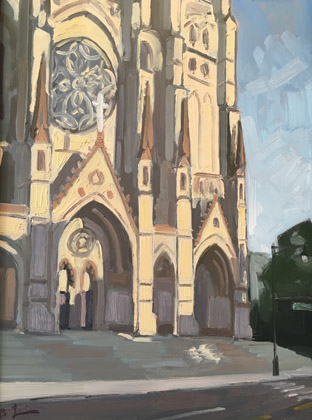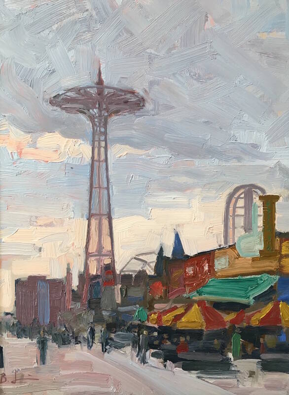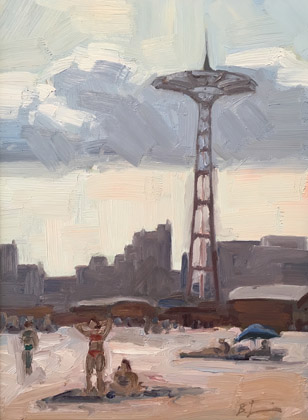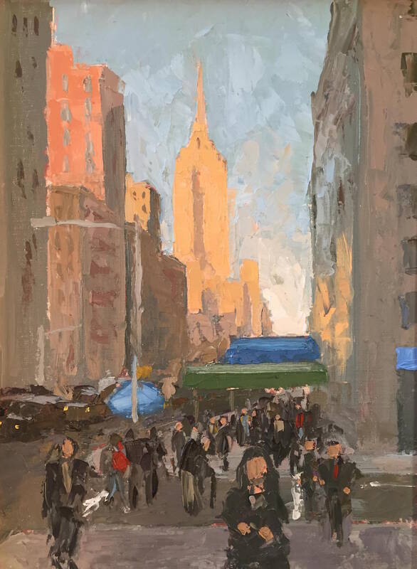 As one of the worlds top plein air painters and well-known bloggers, Marc Dalessio is known for his quick impressions created on site. Dalessio has painted primarily in Europe but recently he has also made New York a painting destination. Amagansett Beach captures the serenity of a misty evening at the ocean. Pale sand, bright green dunes, figures walking along the shoreline towards a horizon that glows from a sun that has just set. In contrast, Dalessio captures mania in Time Square. Bright colors give the impression of billboards, lights, and advertisements that fill the facades of buildings where Broadway meets 42nd Street. Small dashes of dark paint make up the foreground, representing figures, crowded on sidewalks and in the streets.