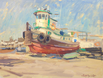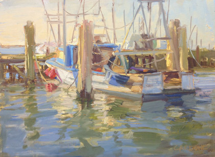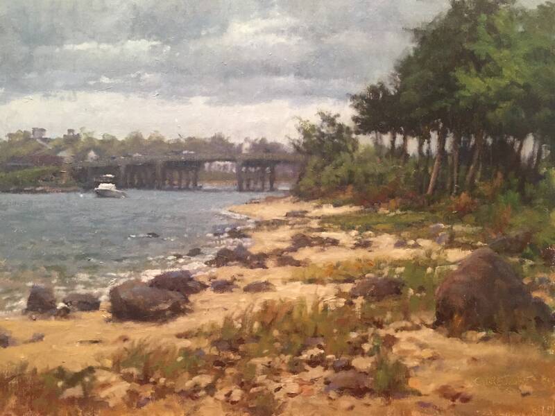 Up-and-coming plein air painter, Benjamin Lussier demonstrates a painterly break from the classical paintings generally found in the Grenning Gallery. His wide, geometric brushstrokes create a plane of textural shapes, differentiating his work from the more traditional academic realism. Painted en plein air in Montauk, New York, Heading Out depicts a fishing boat. The water is a silvery blue, with hints of white, reflecting the overcast sky above. Lussier exaggerates the motion of the water with wide snake-like brushstrokes trailing behind the boat.