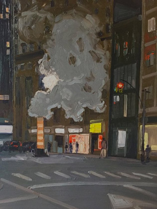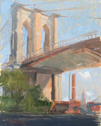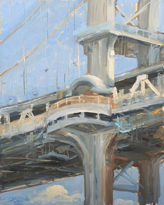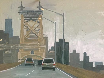 Stephen Bauman and Steven Forster, two skilled artists who also happen to be good friends, have collaborated on a series of cityscapes. Theyve chosen iconic New York structures to depict in their shared tonalist style. Queensboro is a luminous depiction of the Queensboro Bridge reaching across the East River onto a vista of sun-lit suburbia. We suspect Baumans fresh eyes due to his recent return to the US, after ten years of painting and studying in Europe, has helped to create the mysticism rarely seen when one paints a city a bridge. Cool tones complement both the industrial structures steel frame, as well as the natural body of water below. A roof-lined horizon sparkles with pinks and yellows. Neither artists hand excels more than the others; theyve humbled their egos in order to work in pure artistic altruism, an extremely contemporary notion - not witnessed during the 20th century's celebration of self.
