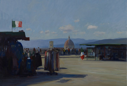 The fact that Dalessio's website and blog found at http://www.marcdalessio.com, which is devoted to plein air painting has become an invaluable resource to painters around the world- might seem a touch ironic since Dalessio is one of the most dedicated traditionalist when it comes to craft. He uses this digital platform to espouse the centuries-old traditions of oil painting. Motivated by his own experiences as a college art student with an unquenchable desire for access to the images, painters, and history and knowledge of en plein airand frustrated by the limitations of availability, creating the digital resource is a natural evolution and organic expression of the artist's generosity of spirit, talent, and emotion--readily on display in the epic works of this show.