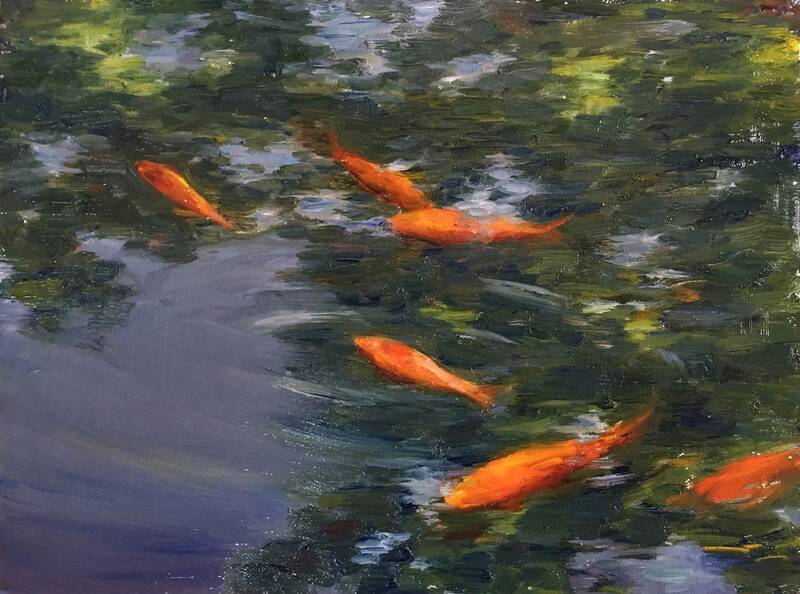 Finally, we will introduce Amy Florence (b. 1989) and Tina Orsolic Dalessio (B. 1983) with their Piscean paintings of beautiful fish ponds.