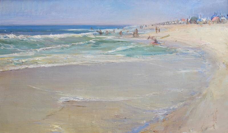Venezuelan, Angel Ramiro Sanchez (b.1974) has been with the Grenning Gallery since its inception and was the first artist invited to summer on the East End in 1998. He was originally hired to paint Laura Grenning's wedding portrait, who knew that would lead to a whole culture of patrons housing Grenning Gallery artists?! He has a keen eye for catching the romantic atmosphere that all summertime visitors bathe in year after year. Last summer, in 2018, Ramiro created a picturesque and truthful depiction of one of Sag Harbor's most popular family beaches, Long Beach.