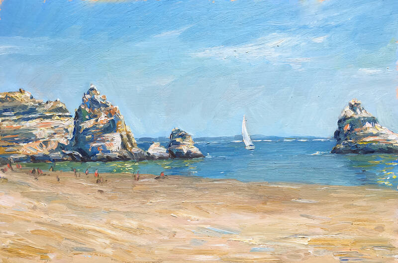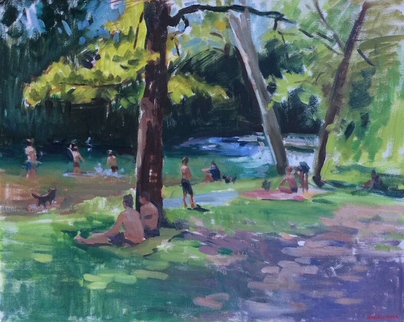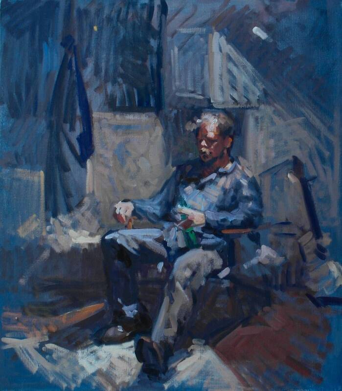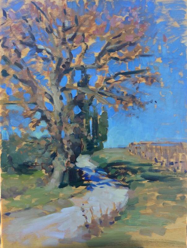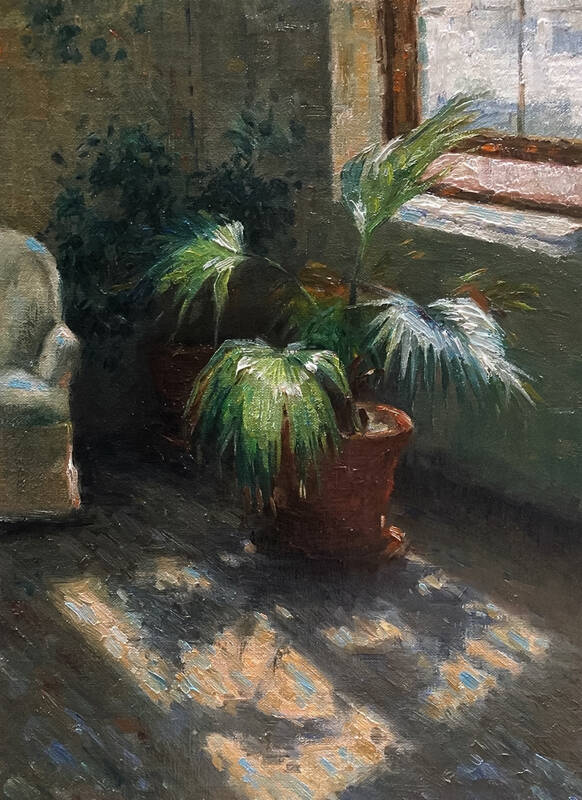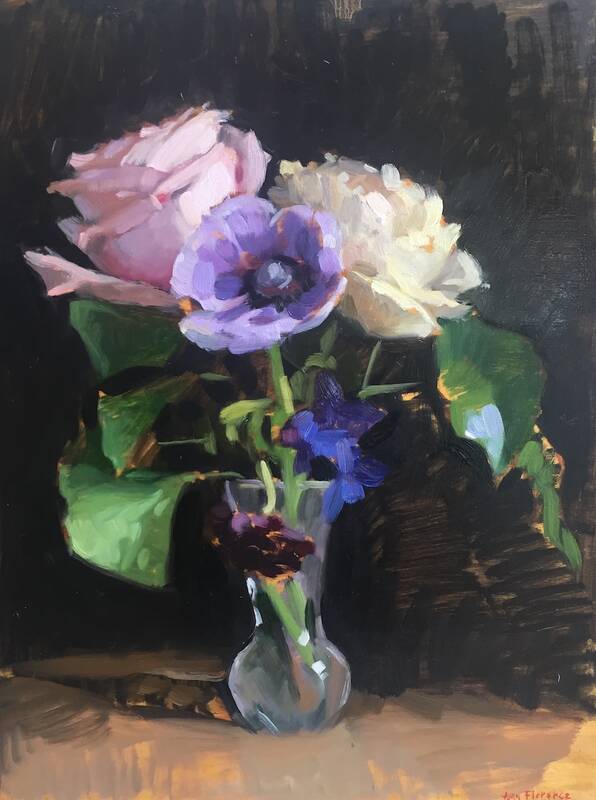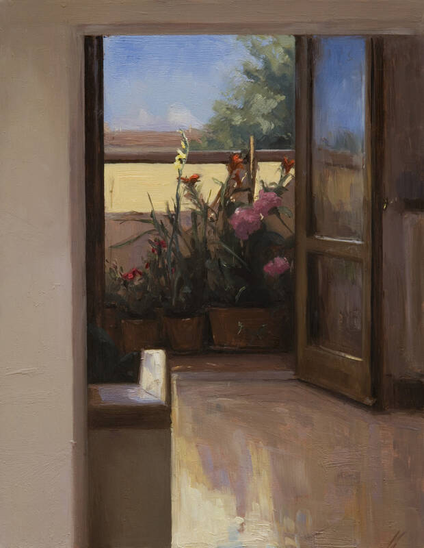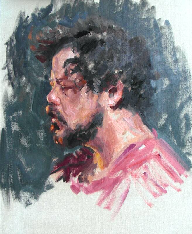 Amy Florence(b. 1989, London) is a classically trained artist working out of Florence, Italy that is new to the Grenning Gallery in the last year. In her work we see a refreshing impressionist approach. In "Out of the Woods" we see her hopeful outlook as she paints a sun dappled road in the countryside exuding a sense of 'opportunities on the road ahead'. In "Florencia" we see a shift to a much more private side of the feminine realm - not on the road, but a woman in complete repose. And here, in Florence's portrait head, that of the man in her life, "Ben Fenske" yet another side of a contemporary woman's life - the part that contains love and relationships.