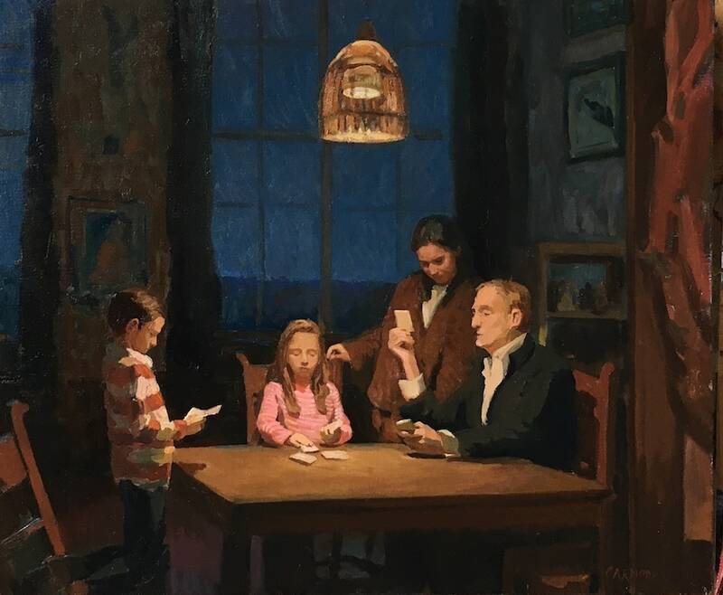 Kelly Carmody(b. 1977, Topsfield, Massachusetts) is well versed in her craft - that of figurative painting. She has exhibited at the BP Portrait Award show in London held in the National Portrait Gallery, as well as at venues across the US including the Portrait Society of America and the Arts Students League. Her meticulous narrative scenes celebrate contemporary family life...yet another realm of these post-feminist era feminists have reclaimed. These scenes are carefully designed to evoke the advantages to the more traditional life of a modern family. She borrows from Mary Cassatt but pushes through to the 21stcentury with her inclusions of men, fathers and grandfathers as active participants.