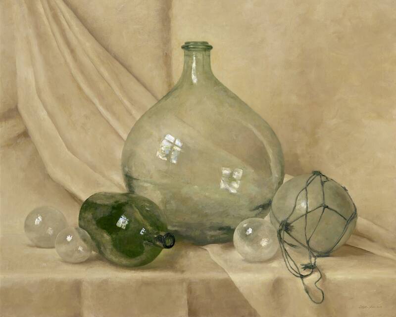 Lamb's rare use of this high key palate in "hand blown glass" still life is a lovely investigation into the cool and warm palette amongst these natural and neutral tones.