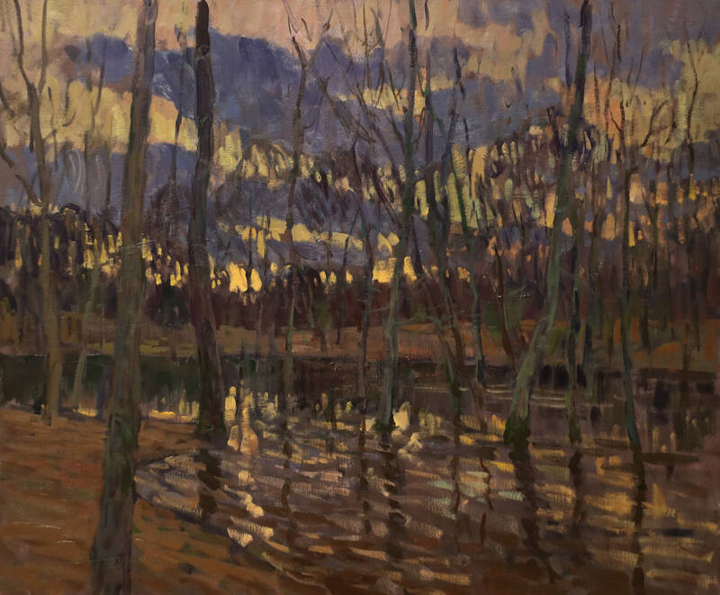 Throughout the year, Butko has deepened his inquiry into the tonal shifts of light at twilight, especially as seen through trees. "Over the Pond, Evening Light" is a mid-winter examination of that theme, where Butko deftly inserts a screen of verticals in the form of light-colored birch trees to offset vertical landscape beyond. The trees also frame sections of his background, highlighting elements that might otherwise be lost, like the shimmering water, effectively painted by this well trained yet contemporary impressionist.