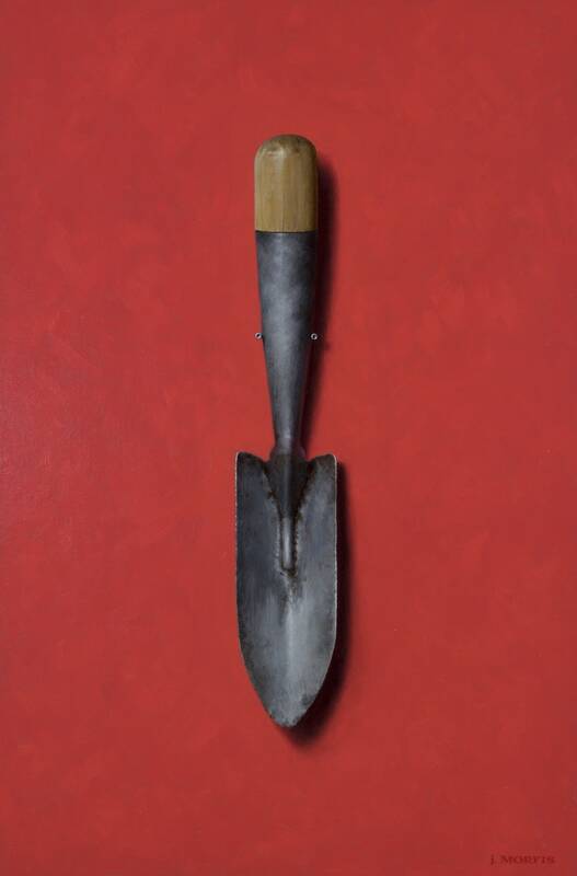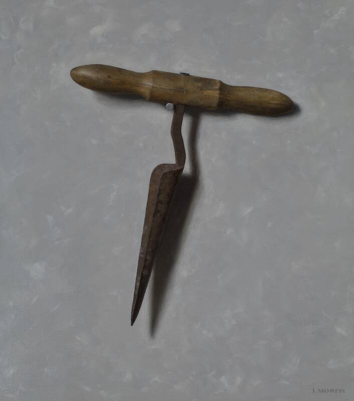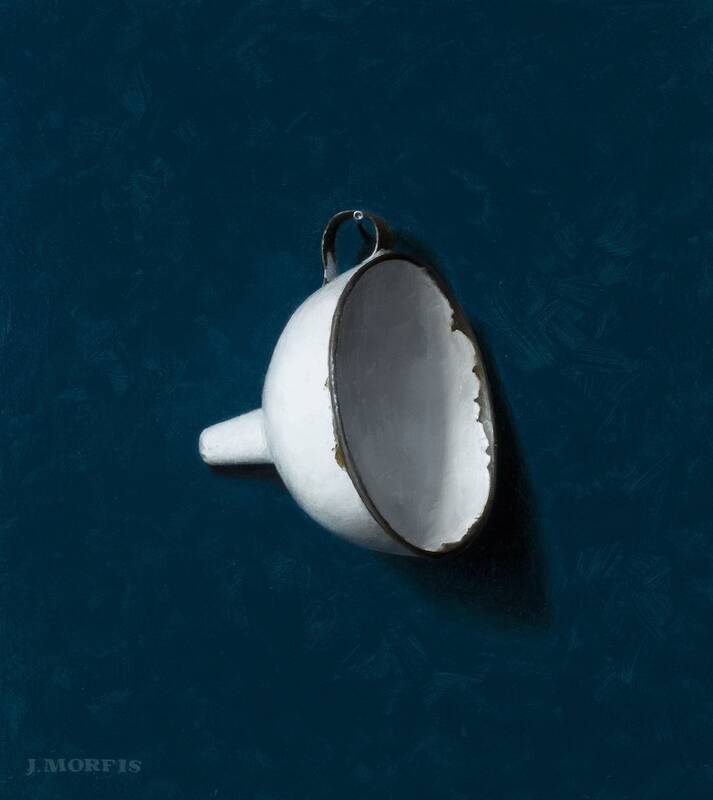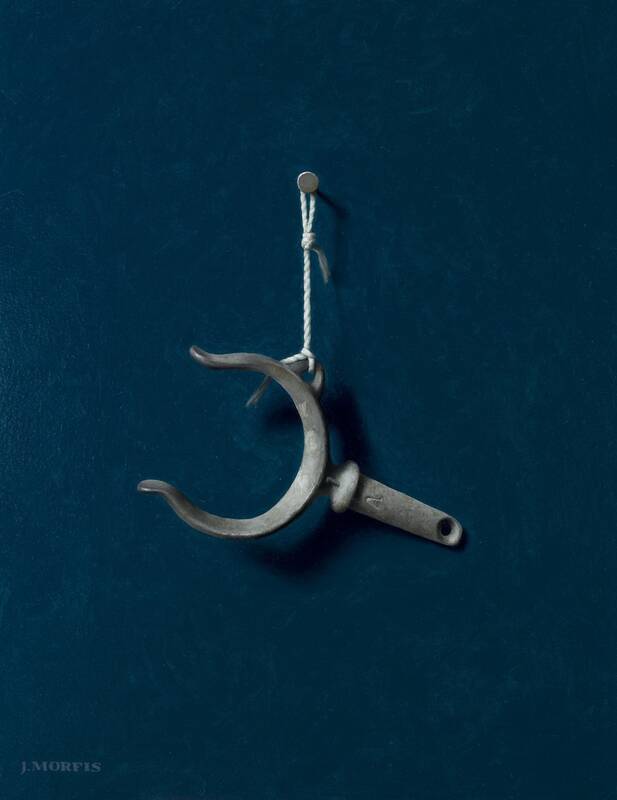 This year John Morfis (b.1976, Bayville, NY) embraces a new backdrop, perfect for his nautical objects, as he sets them in deep, sumptuous navy. Morfis also expands his focus, in this show, onto new subjects; he has selected some interesting antique kitchenware, and he suspends them in front of his signature red, and a bright aqua. Morfis is a Long Island native, renowned for his single-object still life paintings. Each object Morfis chooses to paint has a personal history and sentimental value to the artist. Morfis suspends each object from a single nail before an unadorned backdrop.