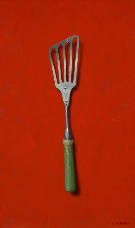 Morfis brings old school enamel kitchenware back into fashion in a series of new paintings. Utilizing popular colors from last year's exhibition, Morfis juxtaposes these items over bright cerulean, navy, and a vibrant fire-engine red backgrounds.