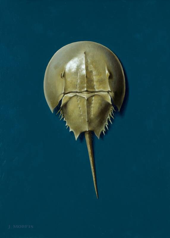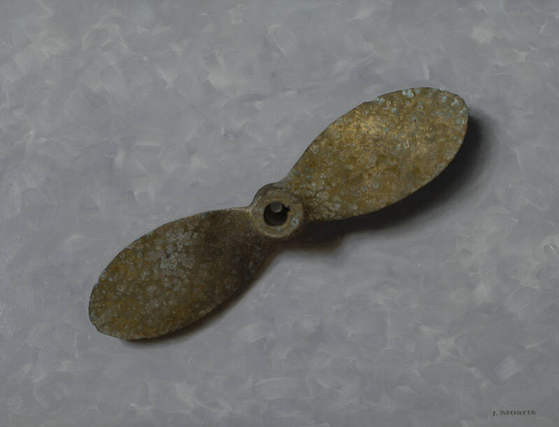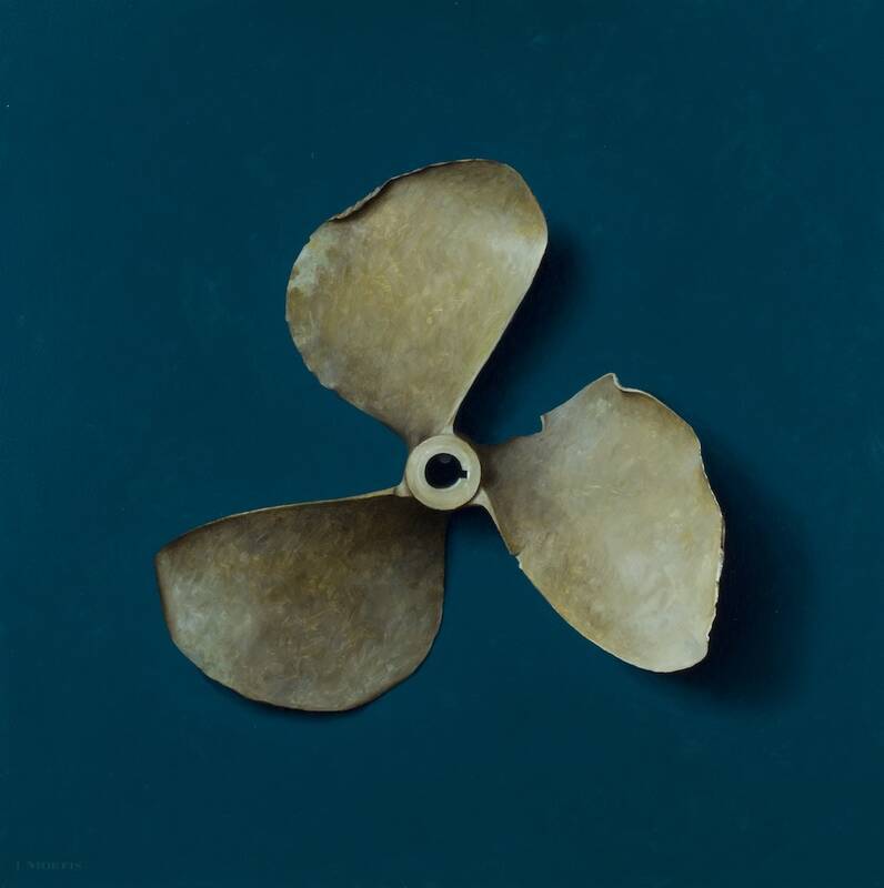 Despite the meticulous dexterities required to create these hyperreal still-life paintings, we can tell that Morfis is having fun while he paints. For instance, we feel Morfis's sense of humor within titling "What Jetty? (Damaged Prop)" which showcases an old beat-up boat propeller. Curled, rusty edges turn inwards in obvious impairment. The flaws sanctioned due to a seemingly-negligent boat ride, make this propeller one-of-a-kind, the accident's memory forever embedded in steel.
