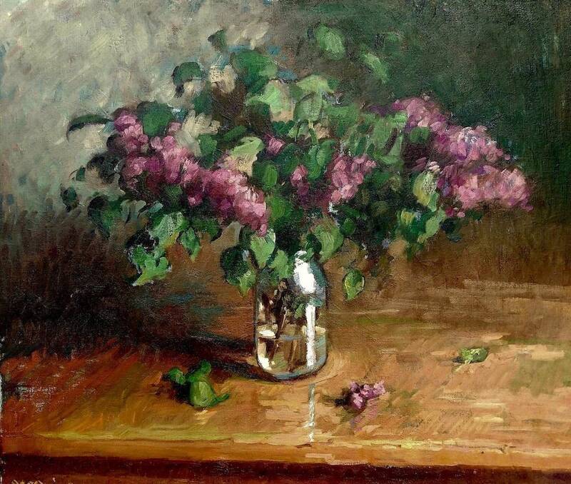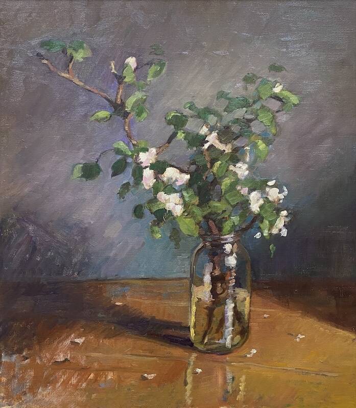 As a classically-trained painter, McGuire has all the tools to create a near-exact realist painting. We see these skills shine in the accurately depicted "Lilacs in a Jar". Granted, McGuire blurs some edges and smudges together defining lines, but the color palette and the shapes illustrated are physically organic. In "Apple Blossoms in a Small Jar" we see McGuire's palette move towards an unearthly spectrum. The white blossoms bounce with light against a cheery teal backdrop. It's like he's turning-up-the-volume of the pigments on his brush.