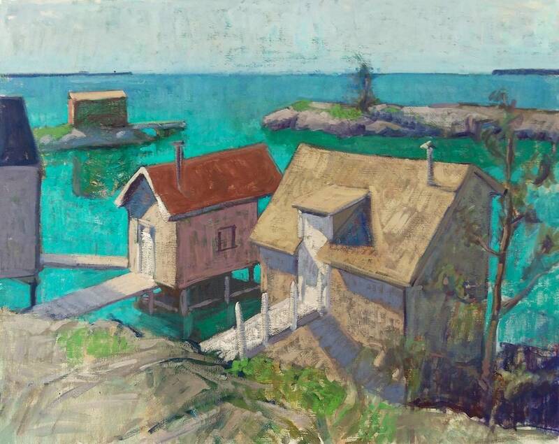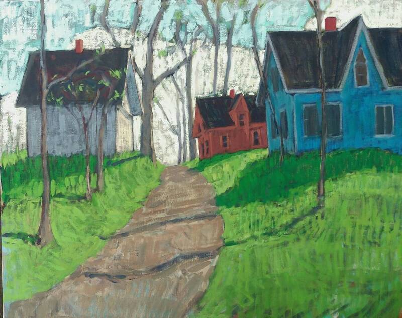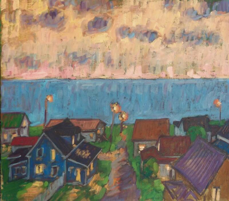 A prime example of McGuire's ability to paint naturalistically, and stylistically, is in his series of fishing shacks. "Fishing Shacks, Morning" and "Fishing Shacks, Big". It appears, that they are both landscape paintings of the same setting; fishing shacks, as seen from above, jutting off of hillsides over an inlet of water, up in Nova Scotia. However, the differences between the two paintings are plentiful. We saw a more naturalistic representation in "Fishing Shacks, Big", when we were looking for images for our online marketing and we got the image on the left below. This massive five foot by 6-foot oil painting hones-in on one shack in particular, its slanted red roof absorbing the sunlight, the body of this small shed resides in shadow, and cascades shade onto the water beside it, where two row boats float. The water throughout is a natural blue, with hints of green, suitable to the north-eastern Atlantic Ocean. Details don't go un-noticed within this large painting, a firm, grey overcast sky meets a natural blue ocean, where an impressive large sailboat soars across the horizon. And then, when we pressed him for final final images of the major work for today's press release, we got the fabulously interesting Edward Scissorhands-ish painting on the right below.