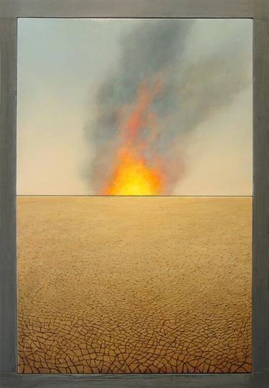 In "Air and Water: Long Island Grays" Straus has affixed two panels together. The bottom panel portrays the open sea, ripples of minor waves sift along the water's surface. The top panel shows a pale sky, where not much seems to be happening. The overall result leaves the viewer initially calm, and quickly apprehensive. The power of the water could change at any moment, what lies beneath the surface? What mysteries lie above the clouded overcast sky above? One can choose to bask in the calm, or to give in to anxiety for what could-be lurking nearby. In Fire and Earth, we see the same configuration, of two panels affixed to each other. This time, the setting is not one to be confused with serenity. The bottom panel shows a parched, cracking earth, which meets the top panel a horizon engulfed in flames. The earth is on fire, it may be in the distance, but it's close enough; and the air we breathe is filling up with thick, black, smoke.