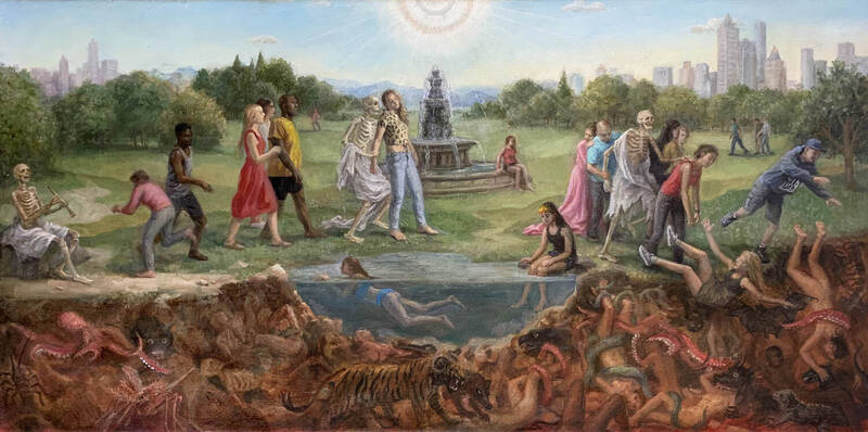 Notably prescient, Kristy Gordon (b.1980, British Colombia) presented us with a series of dystopic painting LAST SEPTEMBER?! In response to the 2016 presidential election, Gordon felt inspired to address what she imagined were pressing social issues through her art. Little did she know that her paintings would come to life. Gordon spent a long while absorbing famed works from pre-renaissance masters Pieter Bruegel the Elder, Hieronymus Bosch, and Jan Van Eyck at the Metropolitan Museum of Art. Jan Van Eyck's "The Last Judgement" was a major inspiration. In "Daily Reprieve" Gordon depicts a walk through sunny Central Park, with a view of reality on several levels. This painting highlights the unseen (and unforeseen) but deadly risks that are everywhere, literally haunting the mostly unaware citizens. The skeletons, which are a symbol of deadly risks are walking with and guiding what seem to be unsuspecting folks, amid unseen dangers which are lurking below the water and ground.