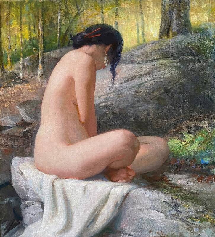 Patricia Watwood (b. 1971 | St. Louis, MO) returns to the Grenning Gallery with reverent and irreverent images of women. In "Femen Flora" we see the depiction of a single participant in an actual annual march for women's freedom held in France. In this work, Watwood has resisted any opportunity to hedge the power of her subject, by depicting her bare breasted, facing the viewer straight on, claiming her freedom literally and figurately - unapologetically feminine with flowers and ribbons in her hair. The goddess Flora lives! And in the two, more contemplative nudes, we see quiet figures, in and of nature...the power of the beautiful curves of woman's nude figure offer the most elemental form of feminine power.
