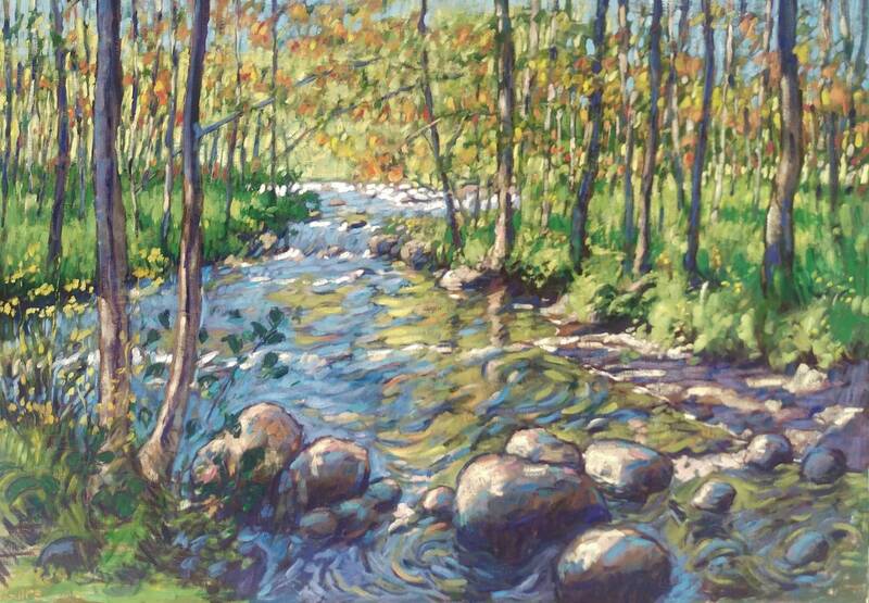 "The Creek", displayed prominently in this show, is a fine example. McGuire, who built an easel especially for this painting, spent incalculable hours observing the creek and even laying his body in the rushing water to physically feel the different textures of rock, water, leaf and trees on his skin. "It was like a dream; the fish jumping around me and the little creatures slithering past." The result is an incredibly successful, actively alive picture literally pulsing with varying colors, textures, and brush stroke.
